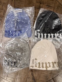 Supreme SS26’ week 1 Old English Printed Beanie Royal, Stone, Olive, Black$65Westbury, NY