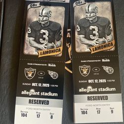 2 Tickets - Las Vegas Raiders vs Tennessee Titans 10/12/2025$300Las Vegas, NV