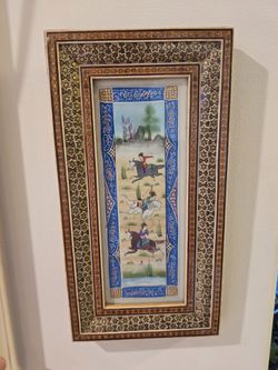 Vintage Persian miniature painting depicting a hunting scene, set within a traditional Khatam marquetry inlay frame$50Rancho Palos Verdes, CA