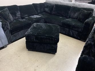 Black Onyx Plush Corduroy Sectional with ottoman and accent pillows 99x99 pick up can deliver $550Rancho Cucamonga, CA