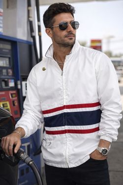 Vintage 70s Cream white Nylon Windbreaker RedBlue Racing Stripes Embroidered Bee Sz M$50Whittier, CA