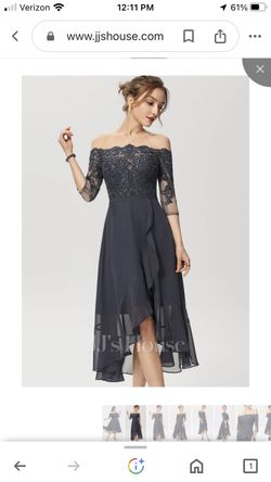 JJ’S House Dress Wedding Guest Off Shoulder Asymmetrical Chiffon Lace Black Dress Size 6$75San Diego, CA