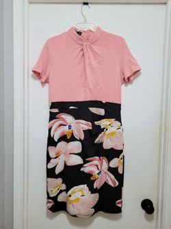 Homeyee Pink Black Floral Midi Tie Neck Short Sleeve Pencil Dress B430 Womens 12$20Tacoma, WA