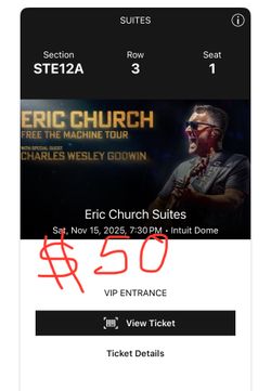 1 Ticket in Suite for Eric Church Tonight at Intuit Dome$50Inglewood, CA