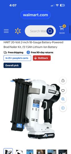 HART 20-Volt 2-inch 18-Gauge Battery-Powered Brad Nailer Kit, (1) 1.5Ah Lithium-Ion Battery And Fast Charger$80Dallas, TX