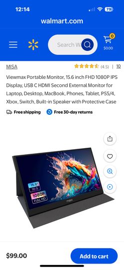 MISA Viewmax Portable Monitor, 15.6 inch FHD 1080P IPS Display$65Dallas, TX