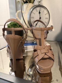 Saint Laurent Beige Patent Leather Platform Stiletto Heels Bow Ankle Strap 37.5$599Farmers Branch, TX