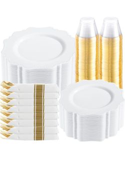 COLOSUS 350pcs White Plastic Plates Disposable Gold Cutlery Dinnerware set for party: 50 Dinner Plate, 50 Dessert Plate, 50 Per Rolled Napkins with Go$40Ypsilanti, MI