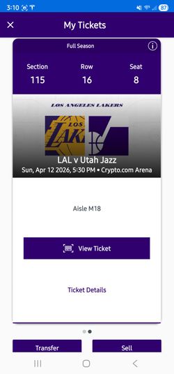 SoldLakers vs Jazz - SECT 115 - $160 EACH$160Chino Hills, CA
