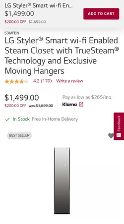 S3MFBN LG Styler® Smart wi-fi Enabled Steam Closet with TrueSteam® Technology and Exclusive Moving Hangers$1,000Deerfield, IL