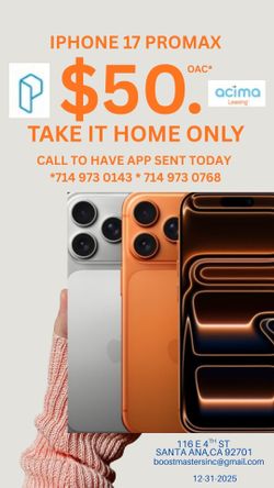 iPhone 17 Pro-max 256 GB. OAC*. $50. $50Santa Ana, CA