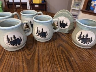 Bear pine trees stoneware pottery mugs, creamer and napkin holder, unmarked$20Middletown, NY