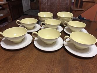 vintage Boontonware melamine yellow & white tea cups, saucers & berry bowls Made in USA $20Middletown, NY