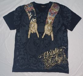 Christian Audigier Men’s XXL Black Los Angeles Graphics Tattoos V Neck T-shirt EUC$60Houston, TX