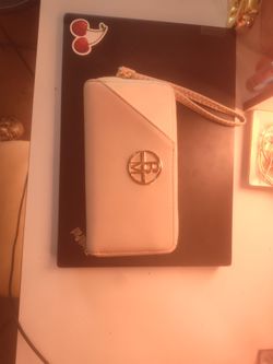 Badgley Mischka Rae collection wristlet wallet in a tan and white color scheme with a gold-tone logo. $20Philadelphia, PA