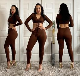 Long Sleeve Crop Top & Leggings Lounge Set Color: Brown Size: S-L rib knit loungeset ruched front long sleeve crop top legging style bottoms regula$40Fairfield, CT