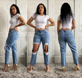 Distressed High Waist Boyfriend Jeans Color: Blue Size: S-L denim boyfriend jeans extreme distressed detail high waist relaxed fit approx length is$49Fairfield, CT