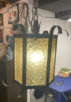 Vintage Spanish Revival wrought iron and amber glass swag light. $700St. Louis, MO
