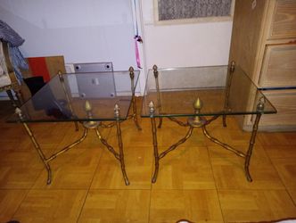Pair Square Glass and Bronze Bagues Style Faux Bamboo End Tables Midcentury 1960$500Boynton Beach, FL