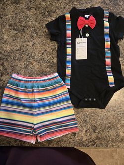 Black baby onesie with red bow and multicoloured shorts set 6-12 Months$15Phoenix, AZ