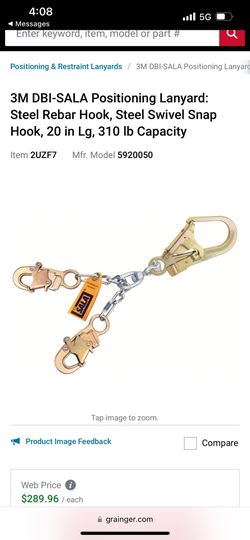 3M DBI-SALA Positioning Lanyard: Steel Rebar Hook, Steel Swivel Snap Hook, 20 in Lg, 310 lb Capacity$50Arlington, WA