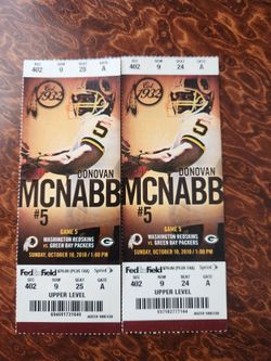 PACKERS At REDSKINS 10/10/2010 TICKET STUBS Donovan McNabb Front Of Ticket $15Moorpark, CA