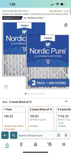 Nordic Pure 20x20x4 MERV 12 Pleated AC Furnace Air Filters 2 Pack$40Long Beach, CA