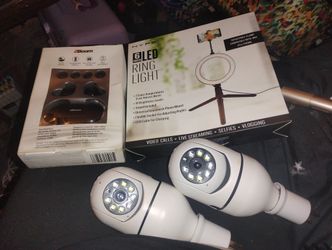 Electronic Odds And Ends Lot - Plug/Screw In Security Cams (Light Bulb Cams) x2, 3/4 Rolls Of Strip Lights, Ring Light, Wireless Ear Buds!$60Winston-salem, NC