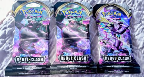 POKEMON SWORD AND SHIELD REBEL CLASH TCG BOOSTER PK 3 AVAILABLE **PRICE IS FOR ALL 3 BOOSTER PACKS ***$75Wenham, MA