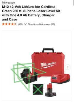 Milwaukee M12 12-Volt Lithium-Ion Cordless Green 250 ft. 3-Plane Laser Level Kit with One 4.0 Ah Battery, Charger and Case$465Los Angeles, CA