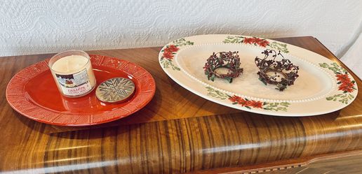 New 22” Embossed Poinsettia Turkey Tray, Red Tray, New Jar Candle & 2 Red Candle Rings$10Bonney Lake, WA