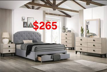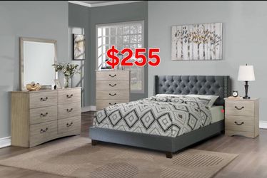 Studded Burlap Grey Queen Bed w Pull Out Drawer!!!$285Rancho Cucamonga, CA