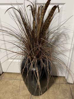Black cement vase with feather and reed decor$25Ramona, CA