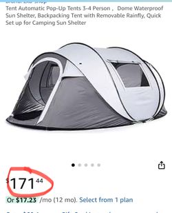 Tent Automatic Pop-Up Tents 3-4 Person, Dome Waterproof Sun Shelter, Backpacking Tent with Removable Rainfly, Quick Set up for Camping Sun Shelter$160Fort Lauderdale, FL