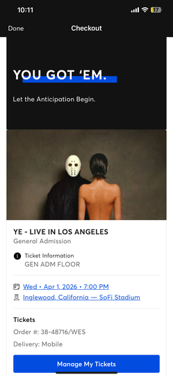 KANYE WEST SOFI STADIUM GA FLOOR TICKETS 04/01/2026$650Lomita, CA