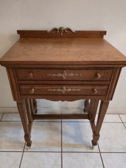 Antique Furniture Sewing Machine Cabinet Vintage Oak Sewing Side Table End Table Vintage Wooden Wheeled$175Winter Springs, FL
