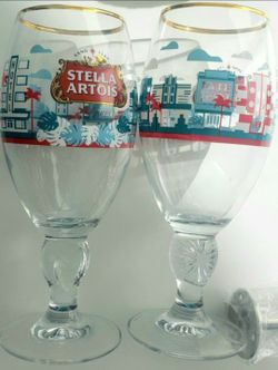 2 New STELLA ARTOIS Beer Wine Glasses Miami Edition Rare Deco Belgian Brewery 8" Chalices Gold-Rimmed South Beach Glassware Goblets F1$25Miami, FL
