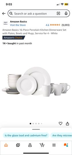 Amazon Basics 16-Piece Porcelain Kitchen Dinnerware Set with Plates, Bowls and Mugs, Service for 4 - White$20Katy, TX
