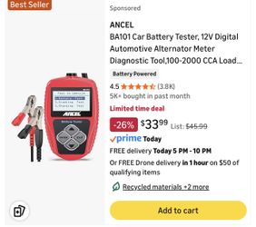 ANCEL BA101 Car Battery Tester, 12V Digital Automotive Alternator Meter Diagnostic Tool,100-2000 CCA Load Capacity, Charging & Cranking Analyzer for T$20Phoenix, AZ