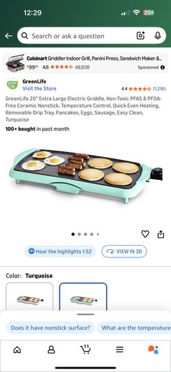GreenLife 20” Extra Large Electric Griddle, Non-Toxic PFAS & PFOA-Free Ceramic Nonstick, Temperature Control, Quick Even Heating, Removable Drip Tray,$40Bolingbrook, IL