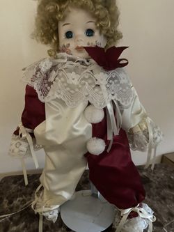 Vintage 1988 Brinn’ S jester porcelain clown doll 16 in w/ roses on Cheeks$25Providence, RI