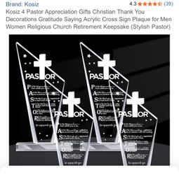 Set of 4 clear LED acrylic pastor appreciation plaques. Each features a cross silhouette and engraved 'PASTOR' text with decorative stars. Sleek, tran$15Cty Of Cmmrce, CA