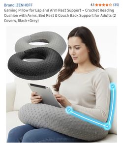 Comfortable crochet reading cushion with arms. Ideal for bed rest and couch back support. Includes two covers in black and gray. New Great gift. $15Bell Gardens, CA