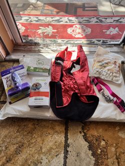 Bundle deal for Dog Items. See pictures l Red black dog jacket - Medium Inflatable Collar - Medium Pink walking collar - M-L Self cleaning slicker $40Bell Gardens, CA