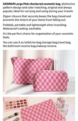 Pink checkered cosmetic bag for organized travel and daily use. Lightweight and foldable with a secure zipper to keep items safely inside. Waterproof-$12Cty Of Cmmrce, CA