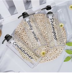 Home Accents clear plastic refillable pump bottle with black pump and labels. Durable, transparent design for easy content visibility. Includes black $15Cty Of Cmmrce, CA