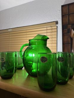 Vintage Anchor Hocking Green Glass Pitcher and glass set all 8 Glasses$75Hialeah, FL