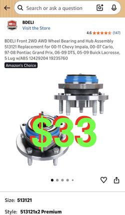Front 2WD AWD Wheel Bearing and Hub Assembly 513121 Replacement for 00-11 Chevy Impala, 00-07 Carlo, 97-08 Pontiac Grand Prix, 06-09 DTS, 05-09 Buick $33Rancho Cucamonga, CA