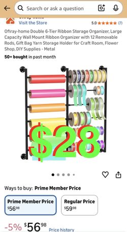 Double 6-Tier Ribbon Storage Organizer, Large Capacity Wall Mount Ribbon Organizer with 12 Removable Rods, Gift Bag Yarn Storage Holder for Craft Room$28Alta Loma, CA