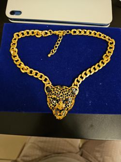 Natasha Black Panther Jaguar Leopard Crystal Gold Tone Head Statement Necklace.$100Halndle Bch, FL